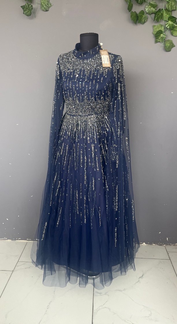 İşlemeli Lacivert Uzun Abiye Elbise