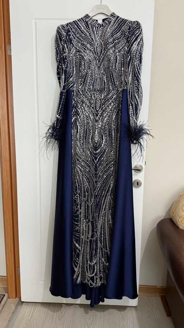 işlemeli ve nakış detaylı, lacivert uzun abiye elbise. Askılı, straplez yaka ve düzenli kesim ile düğünler için uygundur. ✨