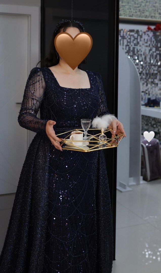 Lacivert uzun abiye elbise, kare yaka ve uzun kollu, işlemeli ve boncuk işlemeleriyle modern klasik tarzda, rahat kesimdir. ✨ Ful taştan oluşmaktadır 40-42 beden uyumludur