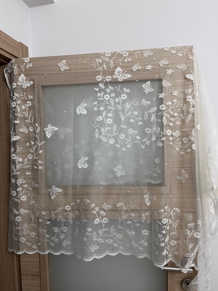 Bej renkli, işlemeli çiçek ve kelebek desenleriyle klasik stile sahip perde. Maasa örtisü kare