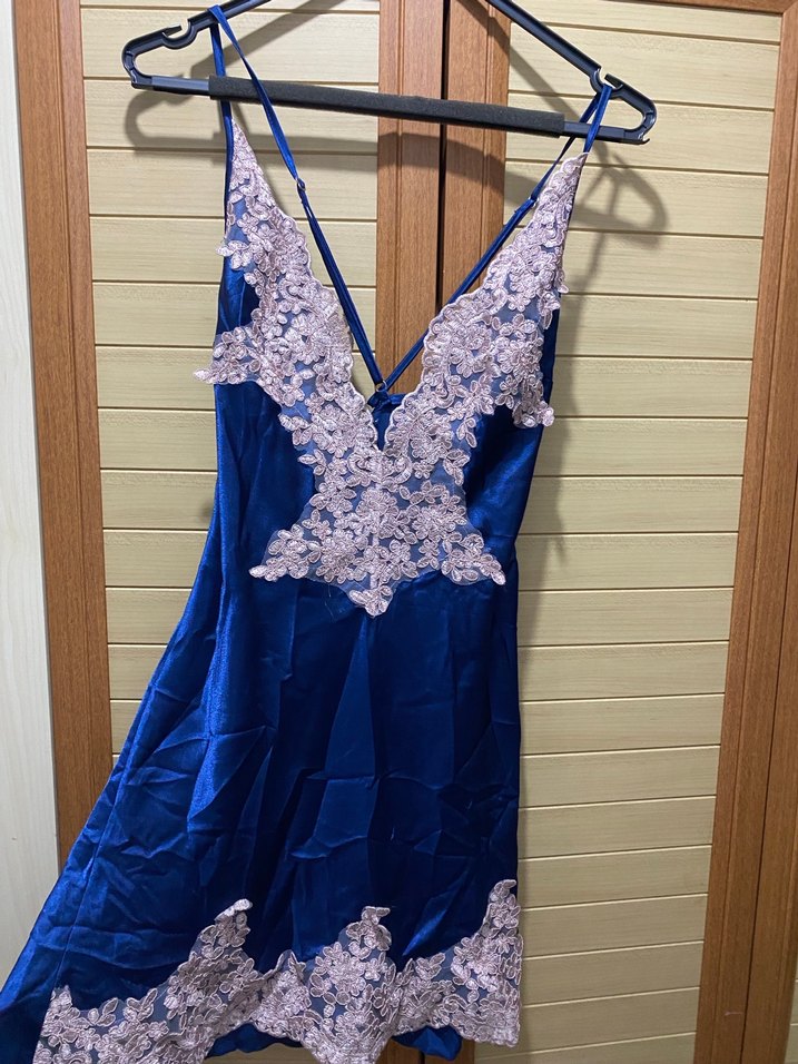 İşlemeli detaylara sahip, parlak mavi kumaştan yapılmış, bohem tarzda askılı ve midi boyda dar kesim geceliktir. Hiç giyilmedi m l uyumlu