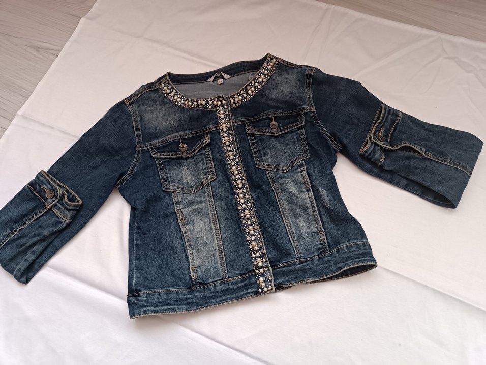 İşlemeli, düğmeli mavi kot ceket, bol kesim ve uzun kollu. Parlak kumaşı günlük kullanıma şıklık katıyor.