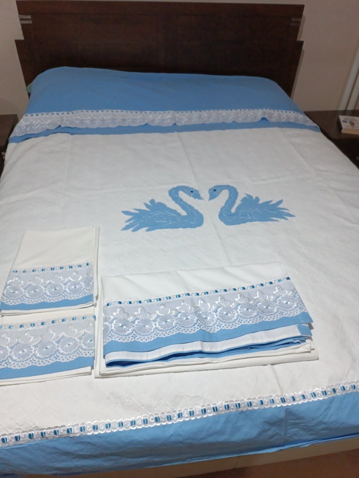 Açık mavi yatak örtüsü, işlemeli kuğu desenleri ve zarif dantel detaylarıyla süslenmiştir. ️Pike, çarşaf ve 2 adet yastık seti.Çeyiz için özel yapıldı.Pike ve yastıklar bir defa kullanıldı ve yıkandı.Çarşaf hiç kullanılmadı.Yepyeni duruyor.Pike 220/215 cm ölçülerinde, çarşaf 208/236 cm ölçülerindedir.Toplam 4 parça ürün gönderilecektir.Yastıklar zarflıdır.Yastıkların birinde hafif sararma olmuş yıkanınca çıkar.