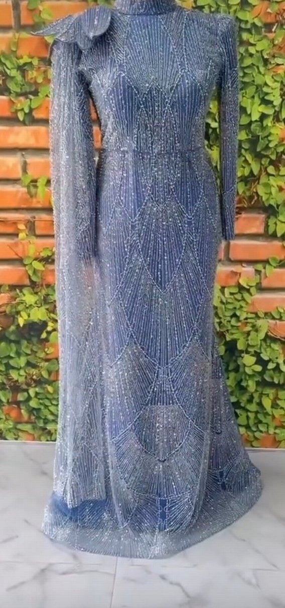 Mavi uzun elbise, V yakalı ve uzun kolludur. İşlemeli ve boncuk detaylarıyla parlak, gösterişli bir görünüm sunar. Rahat kesimlidir ve şık davetlere uygundur. k. ı r. a. l. ı. k. t. ı. r 38-44 beden aralığında şal dahildir