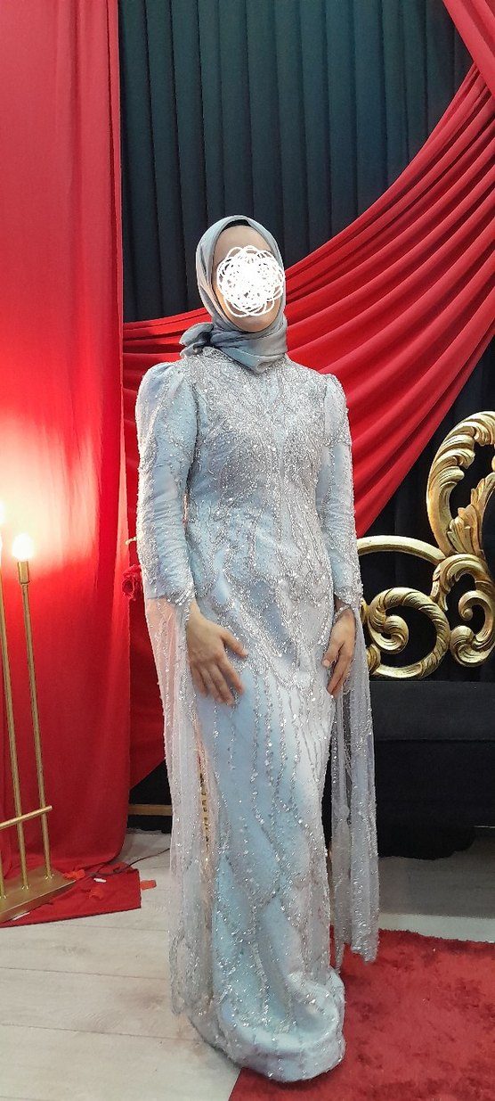 SATILIKK İşlemeli arkası ipli Mavi Uzun Abiye Elbise+ abiye şalı
