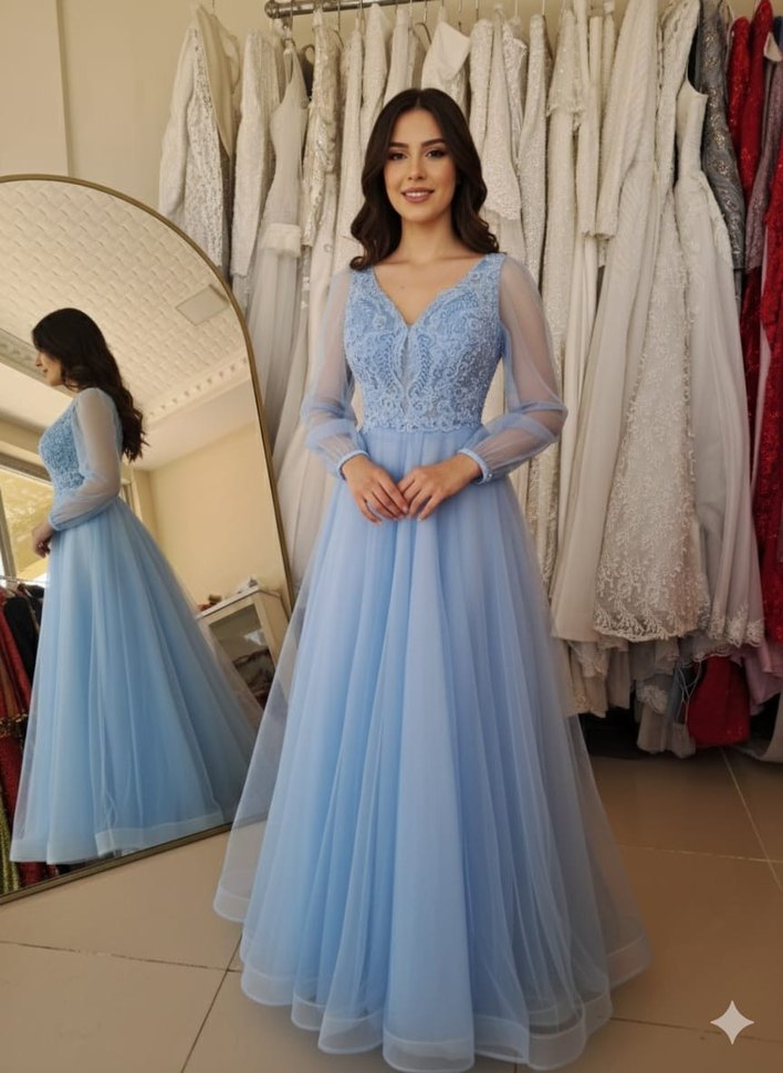 Bu açık mavi nişan elbisesi V yakalı ve uzun kolludur. Düzenli kesime sahip olup zarif işlemeli ve boncuk detaylarıyla klasik şıklığı modern tarzla buluşturur.