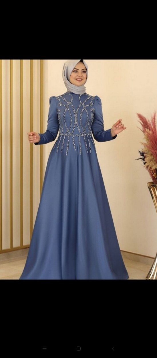Fitted kesim, yüksek yakalı ve uzun kollu mavi abiye elbise, parlak boncuk işlemeleriyle süslenmiştir. Düğün için şık ve modern, mütevazı bir tasarım.