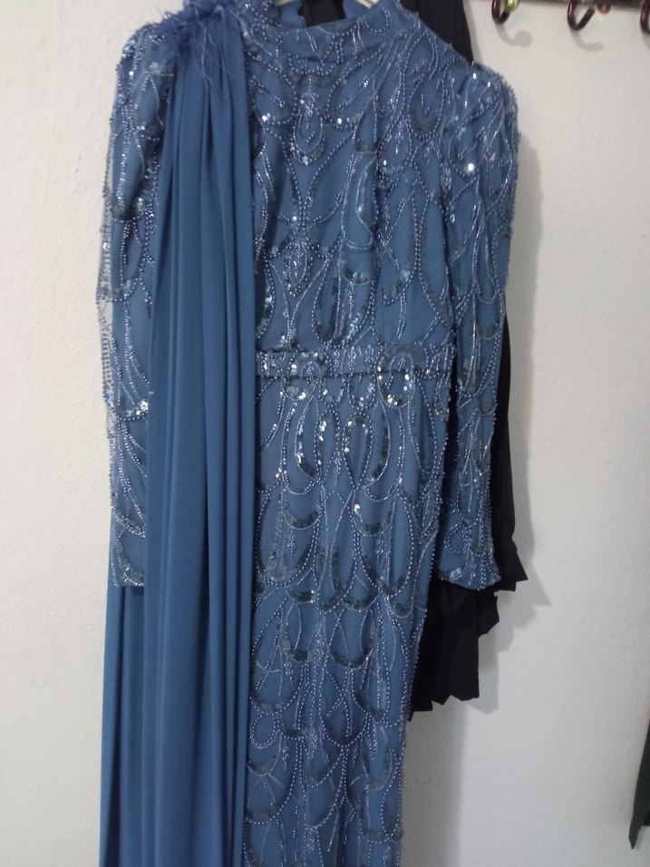 İşlemeli Mavi Uzun Kollu Abiye Elbisr kiralık
