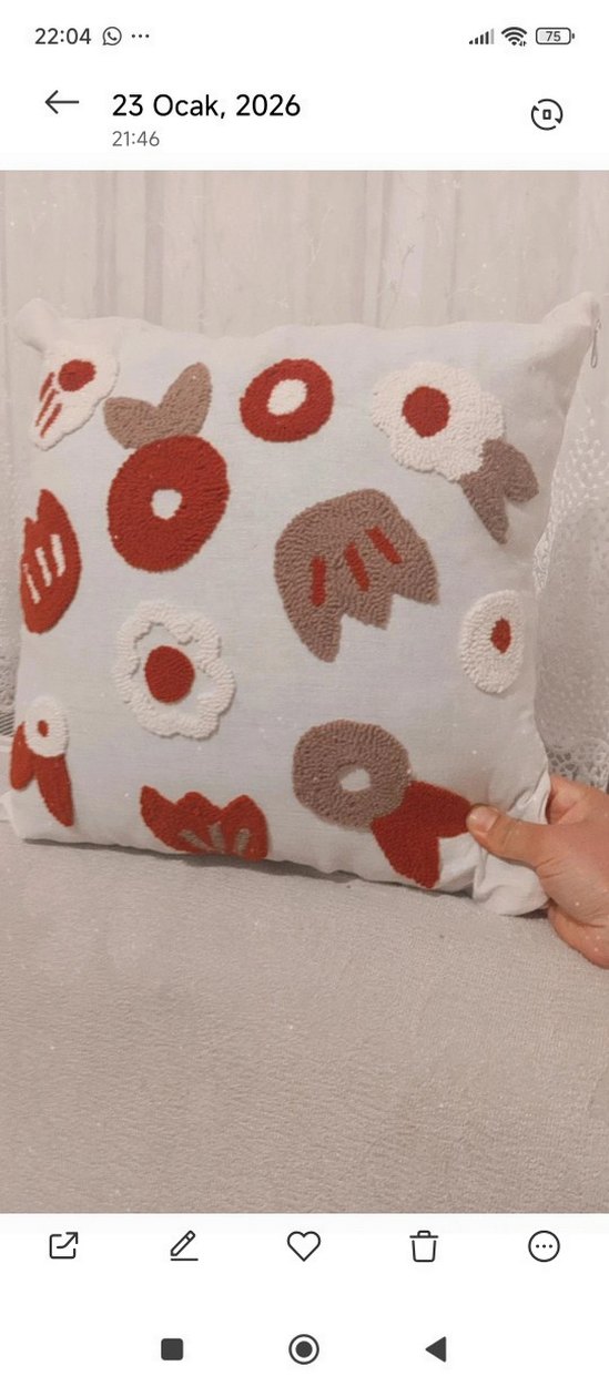 Yumuşak kumaş üzerine gri ve kahverengi tonlarda işlemeli çiçek desenleriyle modern bir dekoratif yastık.