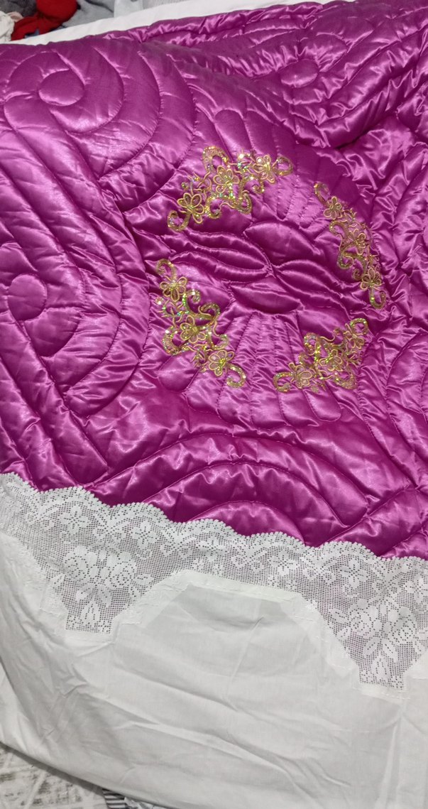 İşlemeli çiçek desenleri ve zarif dantel kenarı bulunan parlak mor yatak örtüsü. Yatak odasına dekoratif bir dokunuş katar. çarşafı yorganı el işi yapılmış Fransız güpürüdür ceyizimden hiç kullanmadım en pahalli parçadır