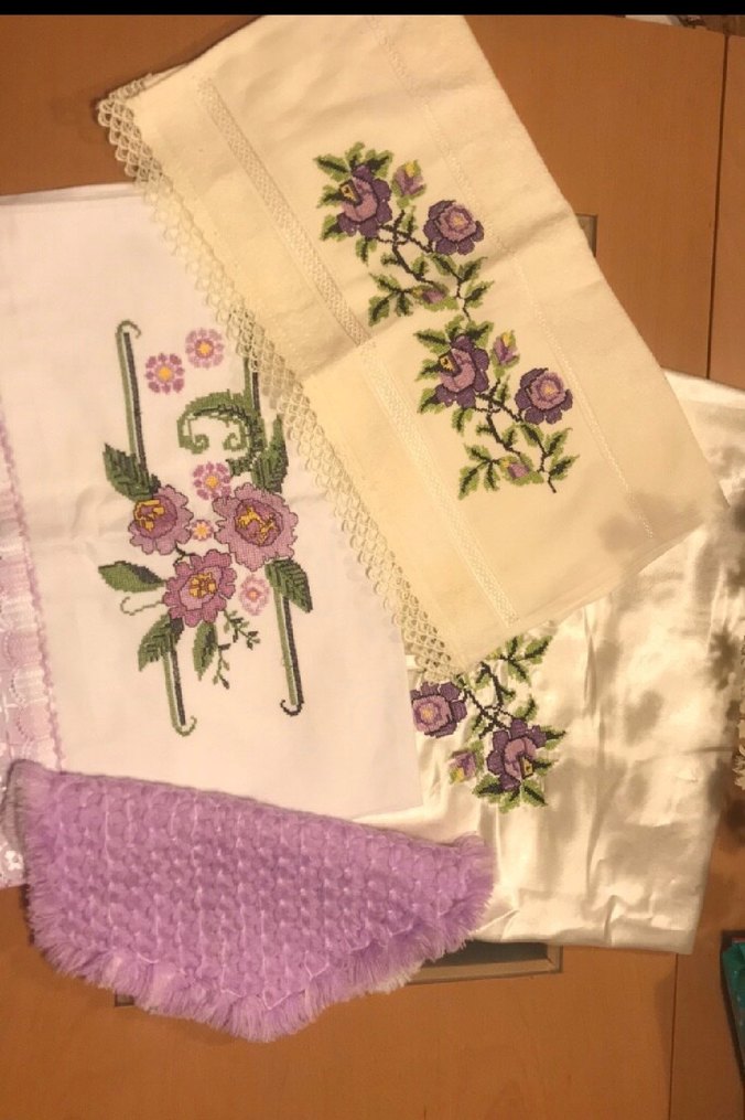 Pastel mor renkte, çiçek işlemeli ve dantel detaylı yastık kılıfı seti. Kumaşı yumuşak ve pürüzsüzdür, dekoratif kullanım için uygundur. İşlemeli havlu çeyiz bohçası bir adet lif iki adet yastık kılıfı