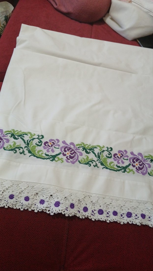 Üst kısmı işlemeli mor çiçek desenli ve alt kısmı küçük mor çiçeklerle süslü dantelli beyaz yorgan kılıfı.
