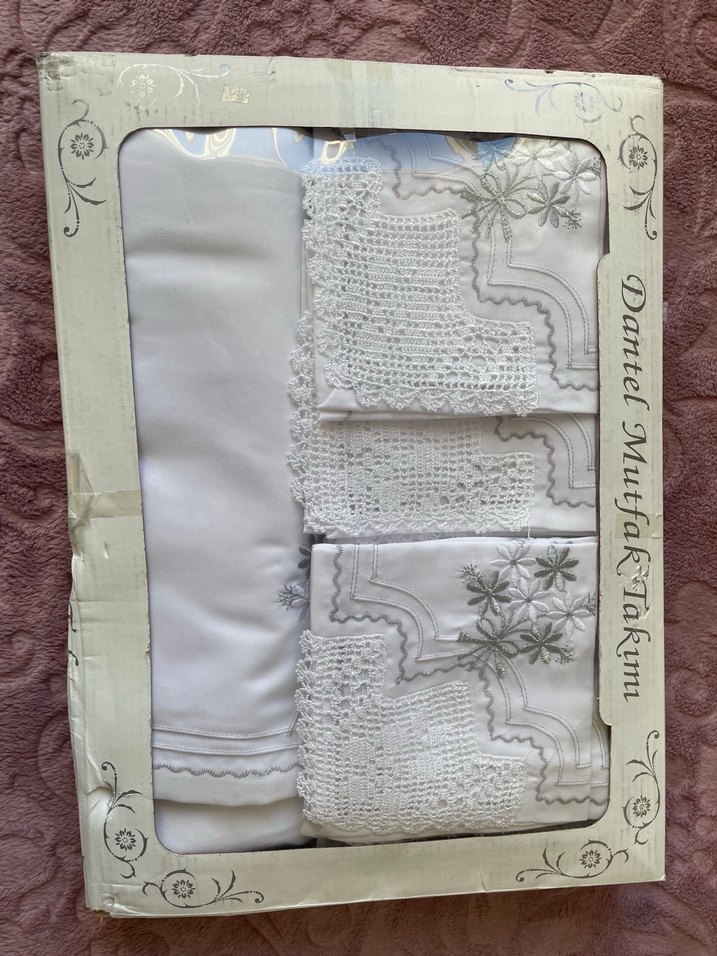 Gri işlemeli ve dantel detaylı beyaz mutfak takımıdır. Zarif desenler ve mutfak takımı içerir. ️ 20 parça ürün bulunmaktadır görsel için açılmıştır yeni kullanılmamıştır