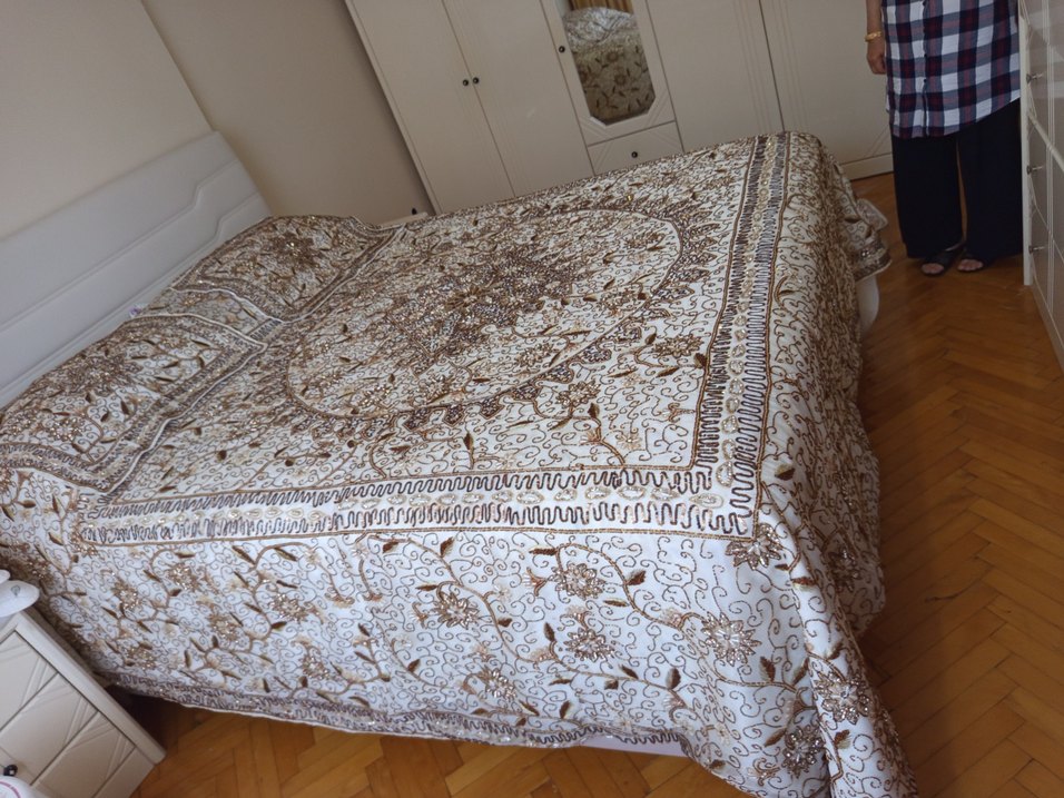 Pullu Boncuklu İşlemeli Otantik Çift Kişilik Yatak Örtüsü (El Yapımı) Dekoratif Yatak Örtüsü: ~300x270cm Dekoratif Yastık Kılıfı: 53*65 (2 Adet) Yatak Örtüsü: %100 Kalın saten kumaş 30 derecede kap içinde elde şampuan ile yıkama altın renkli solmaya dayanıklı çantalı geometrik desen resimler anlatıyor yeni sıfır değerinde verilmek üzere sizlerin karşısında indirim yaptım