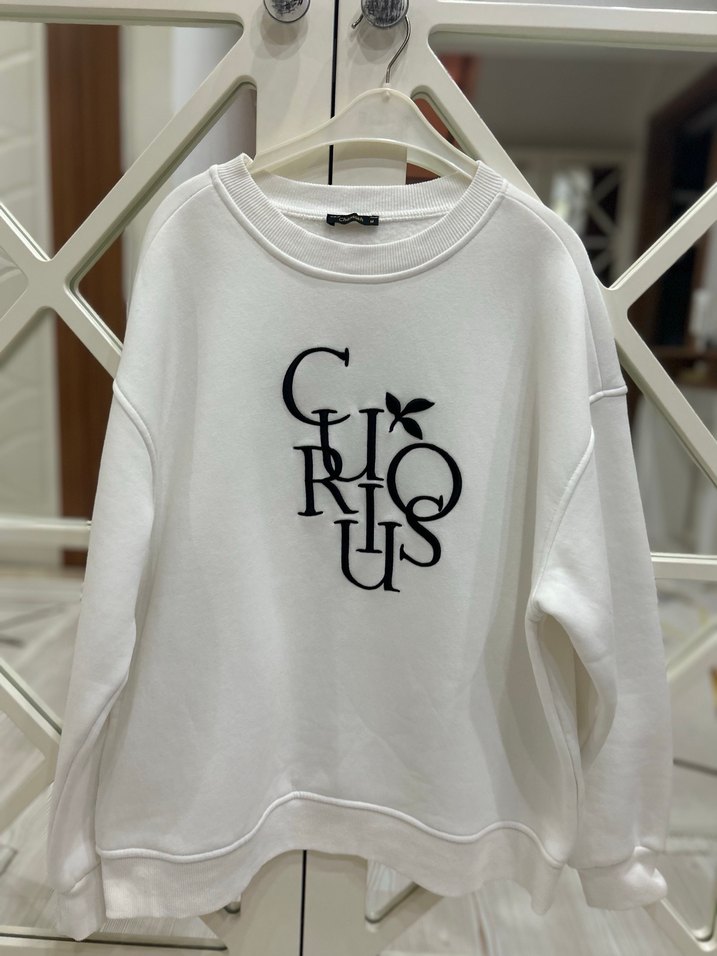 Yumuşak pamuk kumaştan, uzun kollu ve bisiklet yakalı, bol kesim beyaz sweatshirt. 1 kez giyildi sıfır gibidir