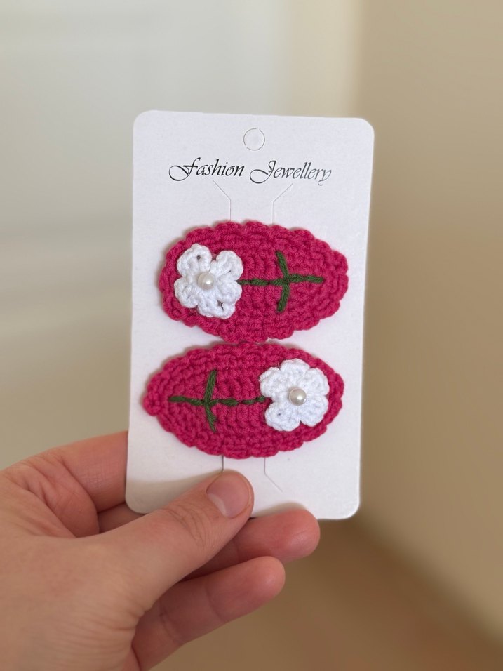 Nakışlı beyaz çiçekli, dantel detaylı pembe tığ işi çocuk tokaları. Bohem tarzda, şık ve sevimli. Papatya İşlemeli Çıt Çıt Toka Pembenin Her Tonu Sizce De Güzel Değil Mi? İkili Fiyatıdır