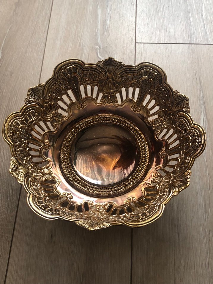 Klasik tarzda, işlemeli desenlere sahip parlak altın renkli Gümüş dekoratif tabak. 30 cm eni.