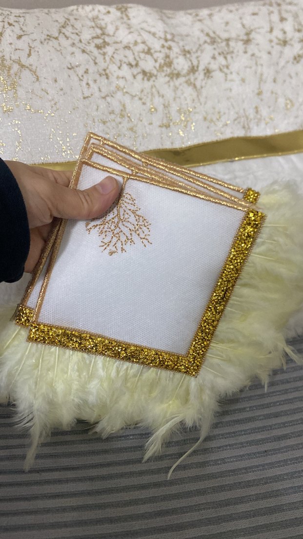 Erkek mendili, işlemeli detaylara ve parlak altın bordüre sahiptir. Yumuşak tüy detaylarıyla rahat ve mütevazı bohem tarzını yansıtır.