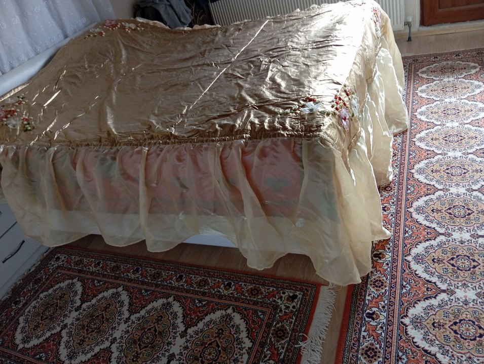 Parlak altın renkli yatak örtüsü, zarif kurdela işi işlendi simli lame kumaş arka astarı simli kaputone eni 1. 40. boyu 2 metredir