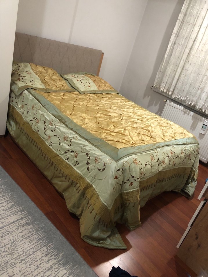 Yatak örtüsü, parlak altın renginde olup detaylı işlemelere sahiptir. Odaya şıklık katarak yatağı tamamen kaplar. ️Afyon Özdilek mağazasından almıştım yatak örtümü