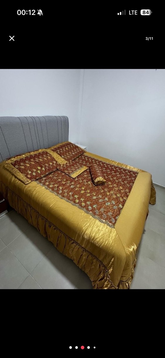 Parlak altın renkli, işlemeli desenlere sahip yatak örtüsü, yatak odasına zengin bir doku katar. ✨