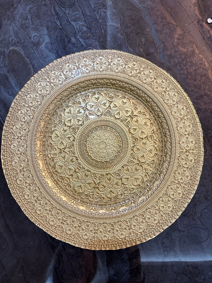 İşlemeli desenlere sahip, parlak altın renkte klasik tarzda bir tabak. ️supladır cam büyük boy elimde 12 adet mevcuttur tekli fiyatıdır