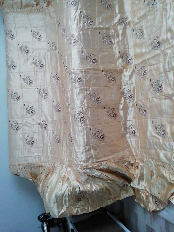 Parlak yüzeyli bej yatak örtüsü, zarif işlemeli çiçek desenlerine sahiptir. Kumaşı pürüzsüz ve parlak dokuludur.