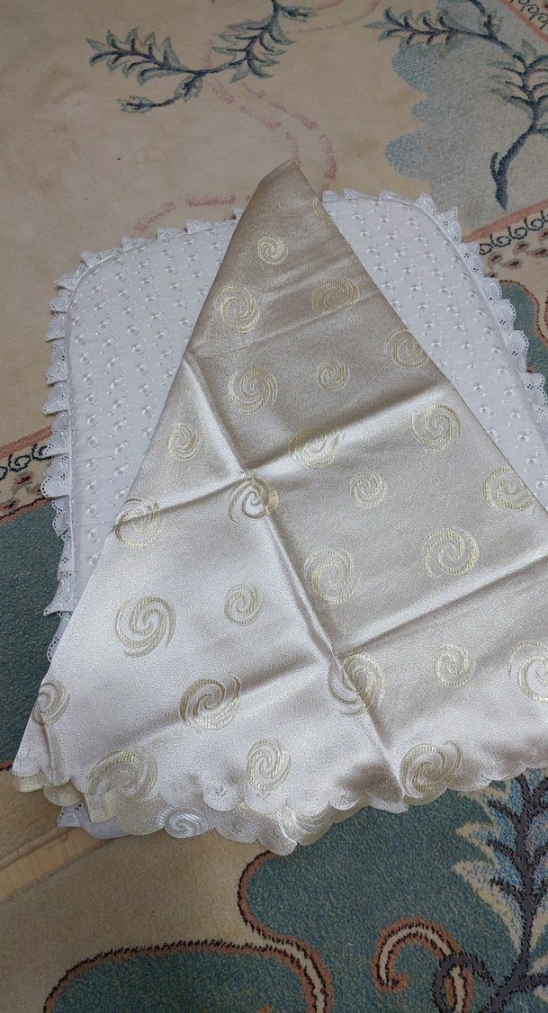İşlemeli desenlere sahip, parlak beyaz klasik tarzda masa örtüsüdür. ✨ 3 adet elimde var tane fiyatıdır.