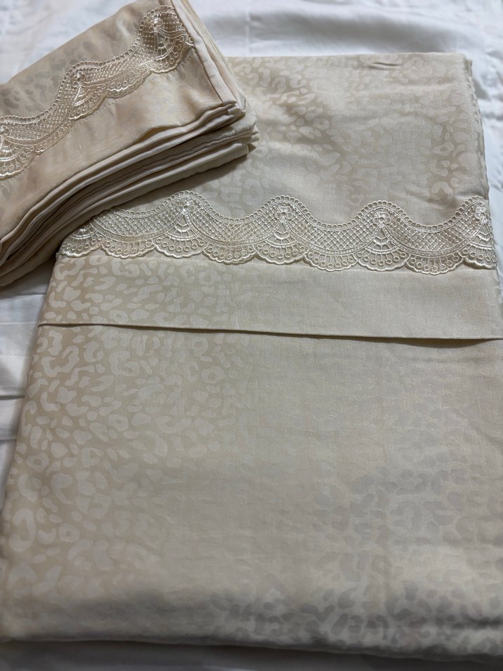 İşlemeli desenli, parlak beyaz kumaştan yapılmış nevresim ve çarşaf takımı, yatak odanıza zarif bir dokunuş katıyor. ️