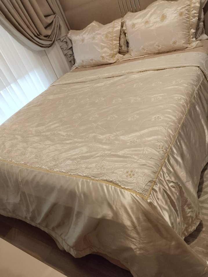 İşlemeli ve parlak beyaz renkte olan bu yatak örtüsü, yatak odasına zarif bir dokunuş katıyor. Yumuşak ve pürüzsüz dokusu konfor sağlar. ️