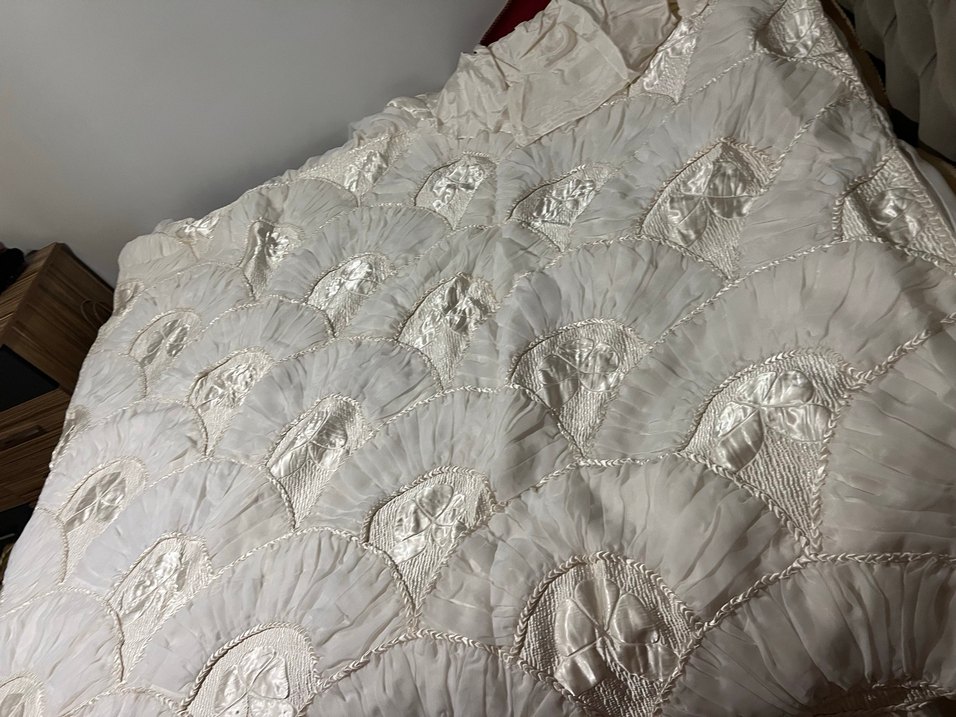 Parlak beyaz renkte, işlemeli desenlere sahip bu battaniye, dokulu ve şık bir görünüm sunar. ️