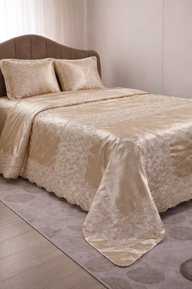 Parlak yüzeyli ve ince işlemeli desenlere sahip beyaz yatak örtüsü, yatak odanıza zarif bir dokunuş katıyor. ✨