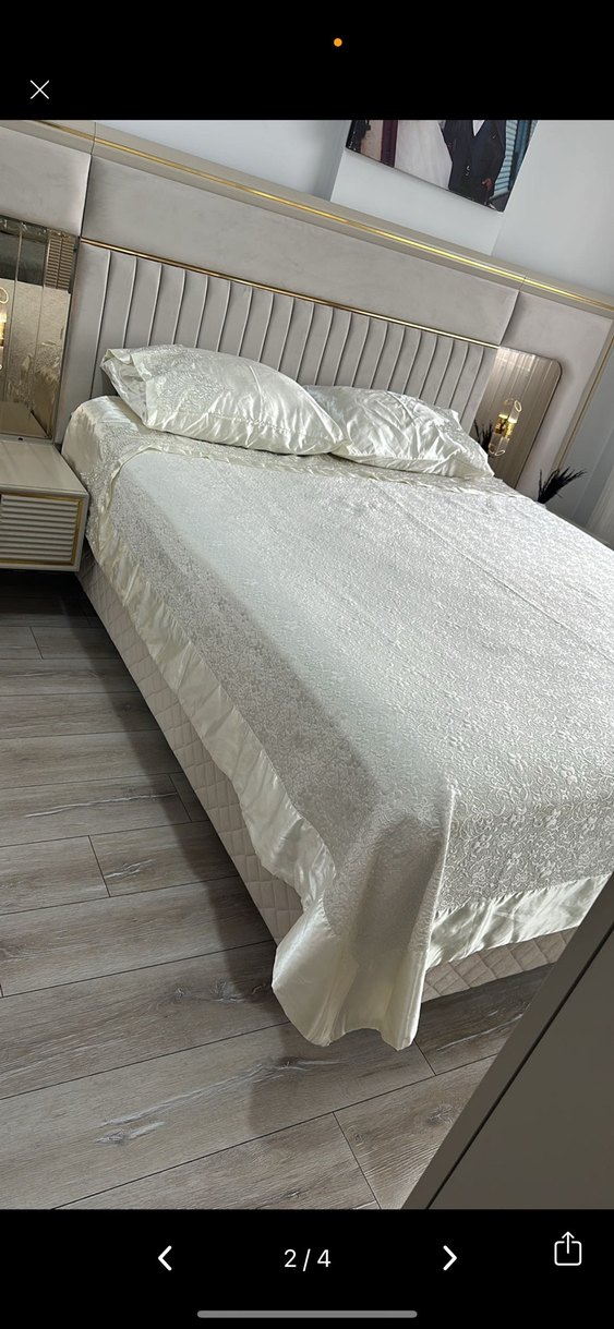 İşlemeli desenli, parlak beyaz yatak örtüsü, yatak odasına zarif bir dokunuş katıyor. ✨