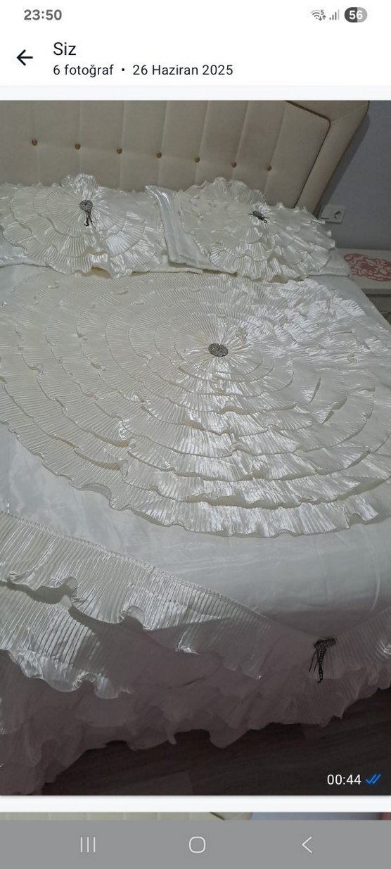 Parlak işlemeli dairesel desenlere ve fırfırlı kenarlara sahip beyaz yatak örtüsü, ortasında dekoratif düğmeler bulunur. ️not sıfır hiç kullanmadım
