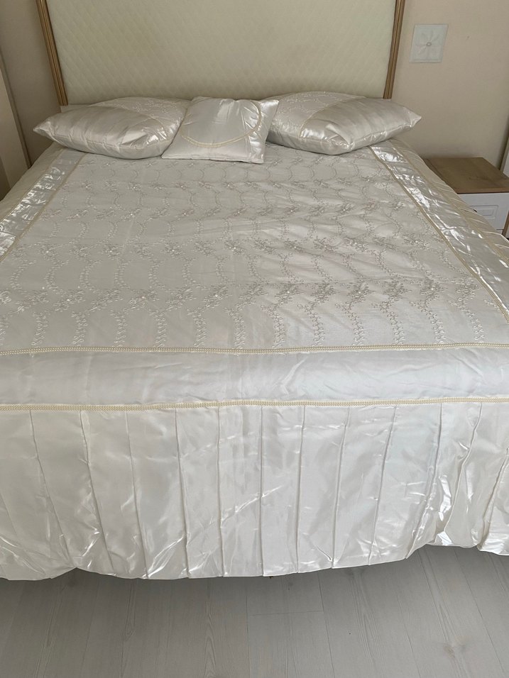 İşlemeli detaylara sahip parlak beyaz yatak örtüsü ve uyumlu yastıklarla yatak odasına şıklık katıyor. ✨1 defa kullanıldı