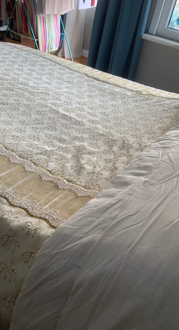 Parlak beyaz renkte, işlemeli ve dantelli kenarlara sahip yatak örtüsüdür. Yatak odanıza şıklık katar. ✨