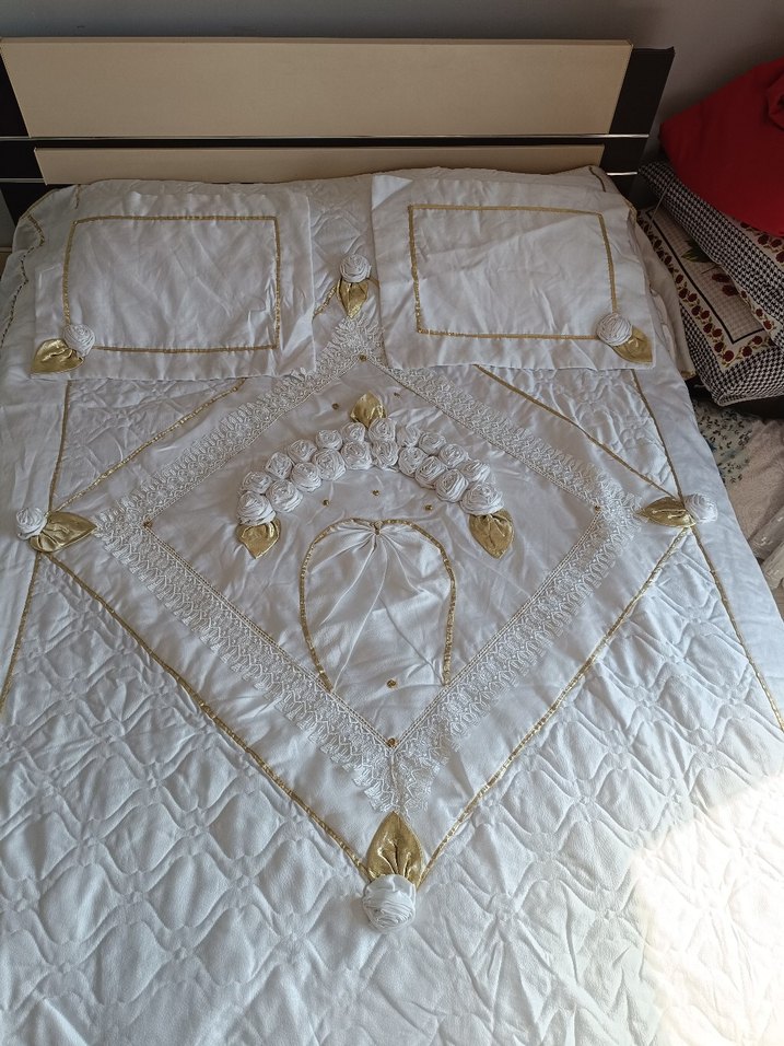Parlak beyaz işlemeli yatak örtüsü, detaylı nakışlar ve süslemeler içerir. Uyumu sağlayan yastık kılıflarıyla birlikte. Bir kere kullanıldı eski çeyizden kalan örtü sürekli katlı kaldığı için gülleri biraz yamuk duruyor ama kullanıldıkça düzelecektir