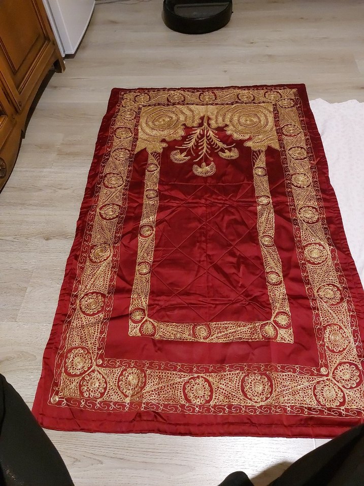 Parlak bordo renkte, işlemeli desenlere sahip geleneksel seccade.