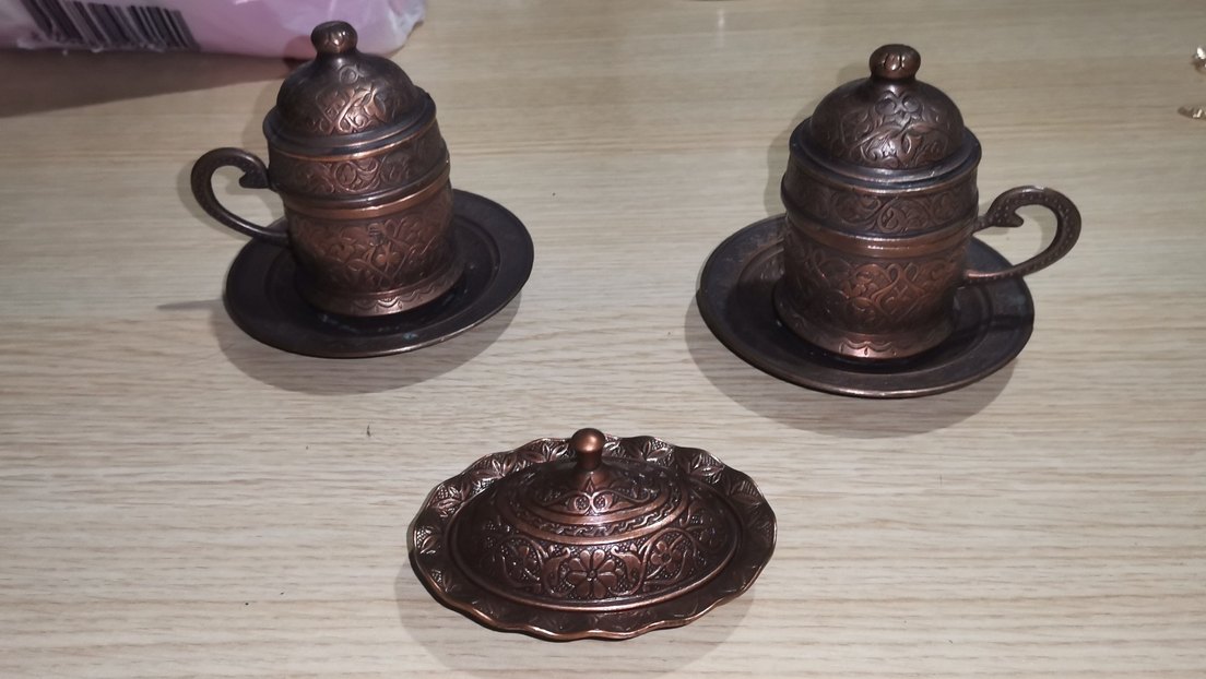 Parlak kahverengi işlemeli desenlere sahip kapaklı tabak ve uyumlu fincanlardan oluşan geleneksel bir tabak seti. ️