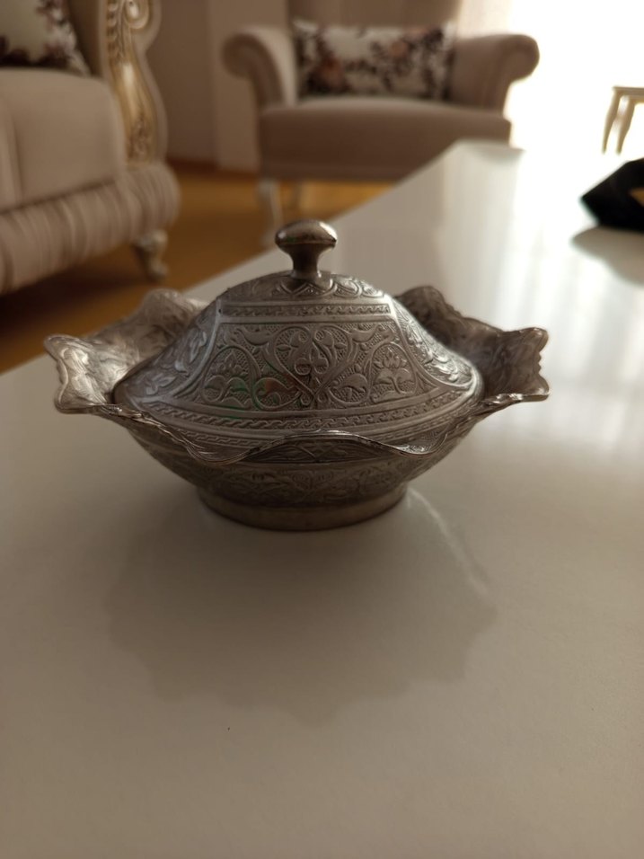 İşlemeli desenlere sahip parlak kahverengi dekoratif tabak, küçük kapaklı ve geleneksel tasarımlıdır. ️