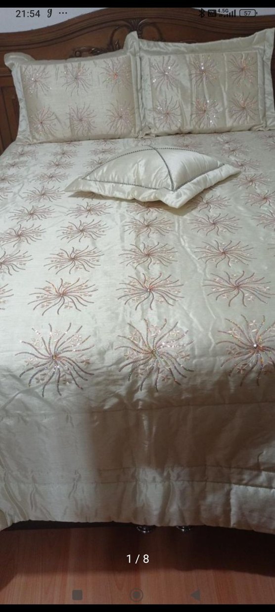 Parlak krem renkte, zarif işlemeli desenlere sahip yatak örtüsü, yatak odasına şık bir dokunuş katıyor. tek iki kere kullanıldı çok temiz yeni sayılacak kadar yeni sus yastığını kendim süsledim istemezseniz çıkarabilirsiniz çift kişilik poşet ve hurcta muhafaza edildi
