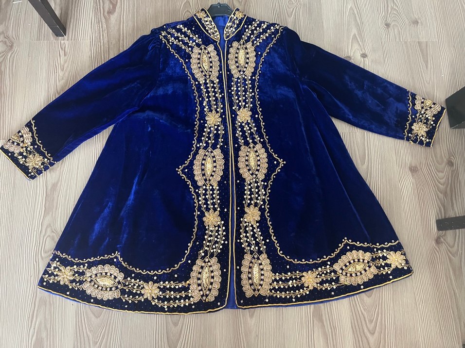 Parlak lacivert kadife kumaştan, işlemeli detaylara sahip, uzun kollu ve uzun boy, bohem tarzda, kaftan