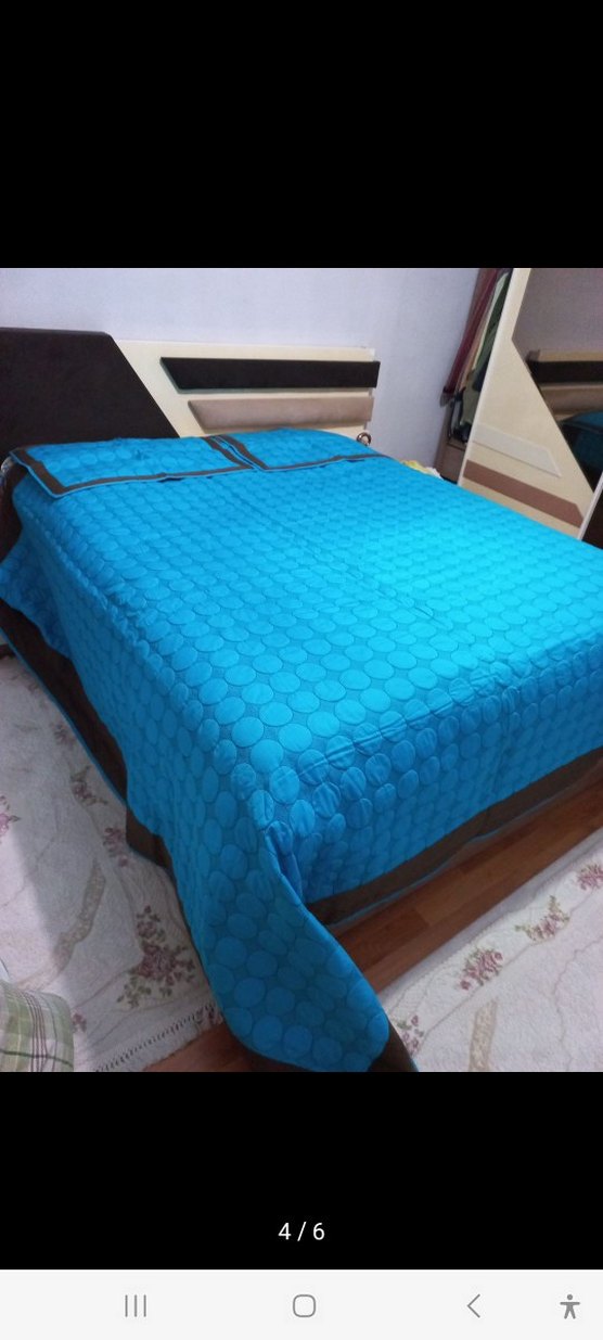 Parlak mavi renkte, işlemeli desene sahip yatak örtüsü, odanıza şıklık ve doku katıyor. ️yüzde yüz pamuk kapiyone