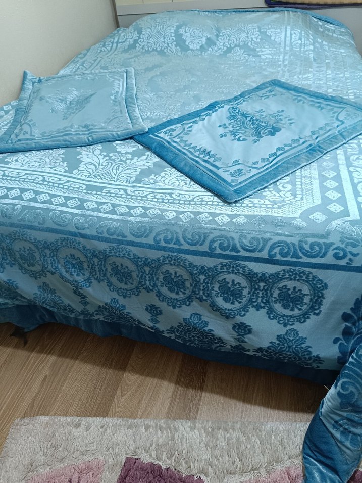 İşlemeli desenlere sahip parlak mavi yatak örtüsü, yatak odanıza zarif bir hava katıyor. Uyumu sağlayan yastık kılıfları ile birlikte.