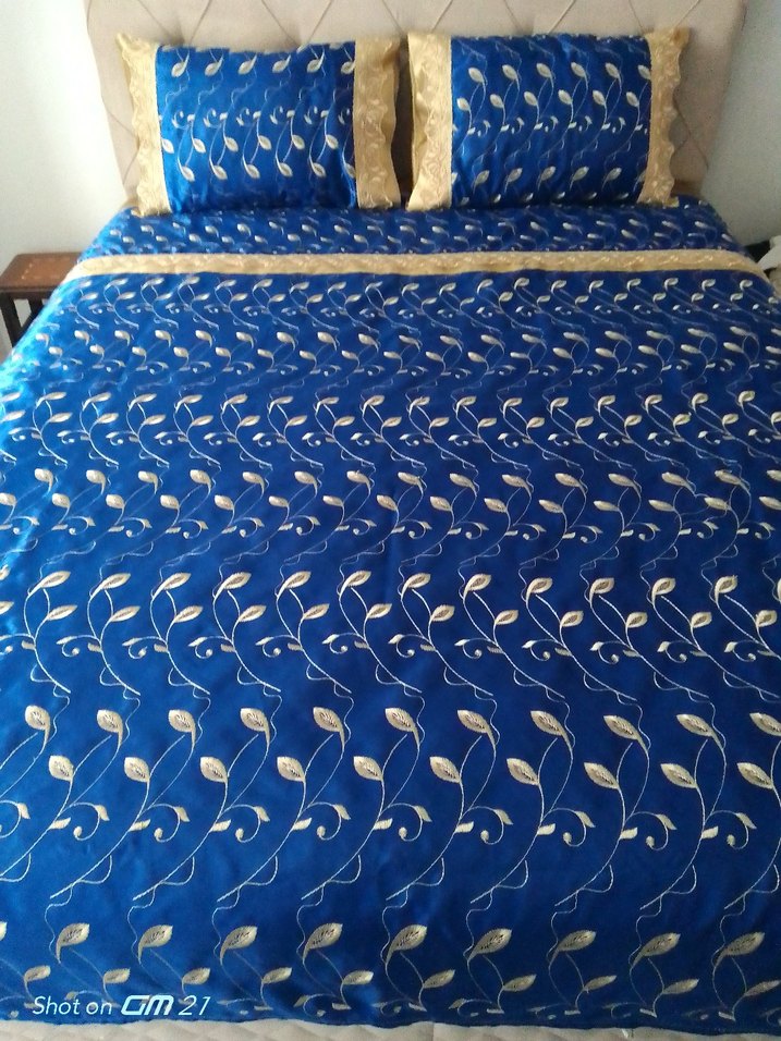Parlak mavi kumaş üzerine işlenmiş desenler ve uyumlu yastık kılıflarıyla dekoratif bir yatak örtüsüdür. ️saten lastikli çarşafi ile birlikte verilecektir.uzunluk 216cm en 200cm.2 adet yastığı vardir