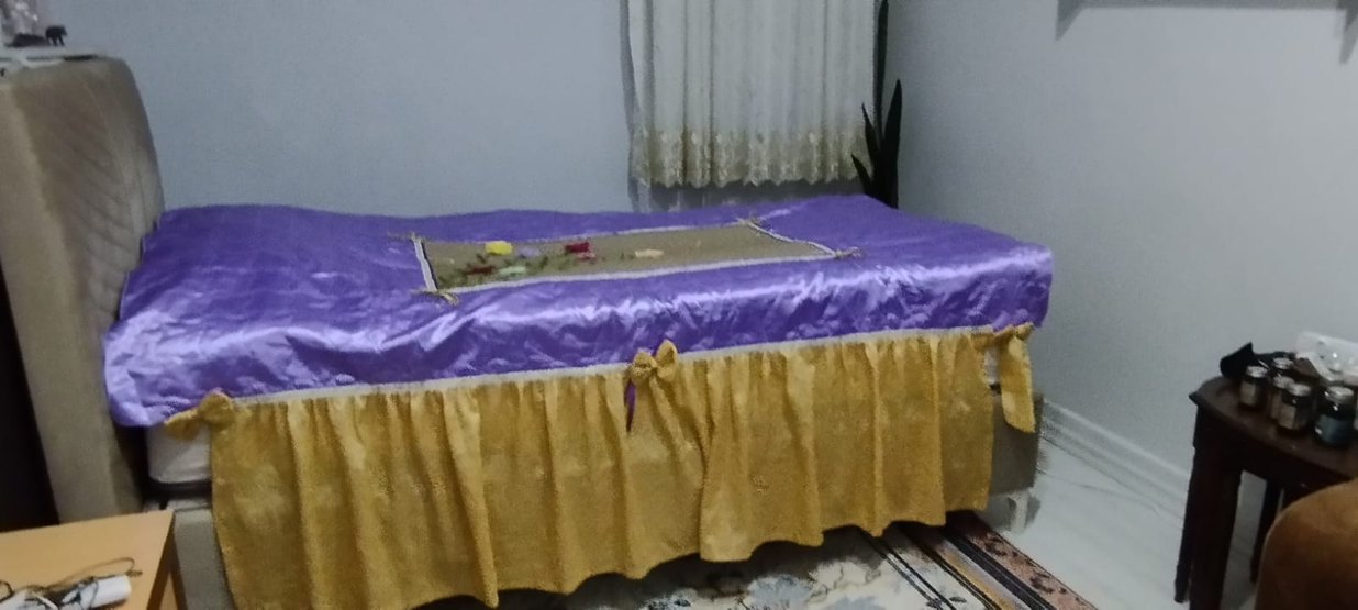 Parlak mor üst kısmı işlemeli detaylarla süslenmiş, sarı fırfırlı etek ve fiyonk içeren yatak örtüsü ️.