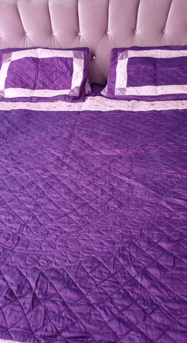 Parlak mor renkli bu yatak örtüsü, detaylı işlemeler ve kapitone dokusuyla, uyumlu yastık kılıflarıyla tamamlanmıştır. ️