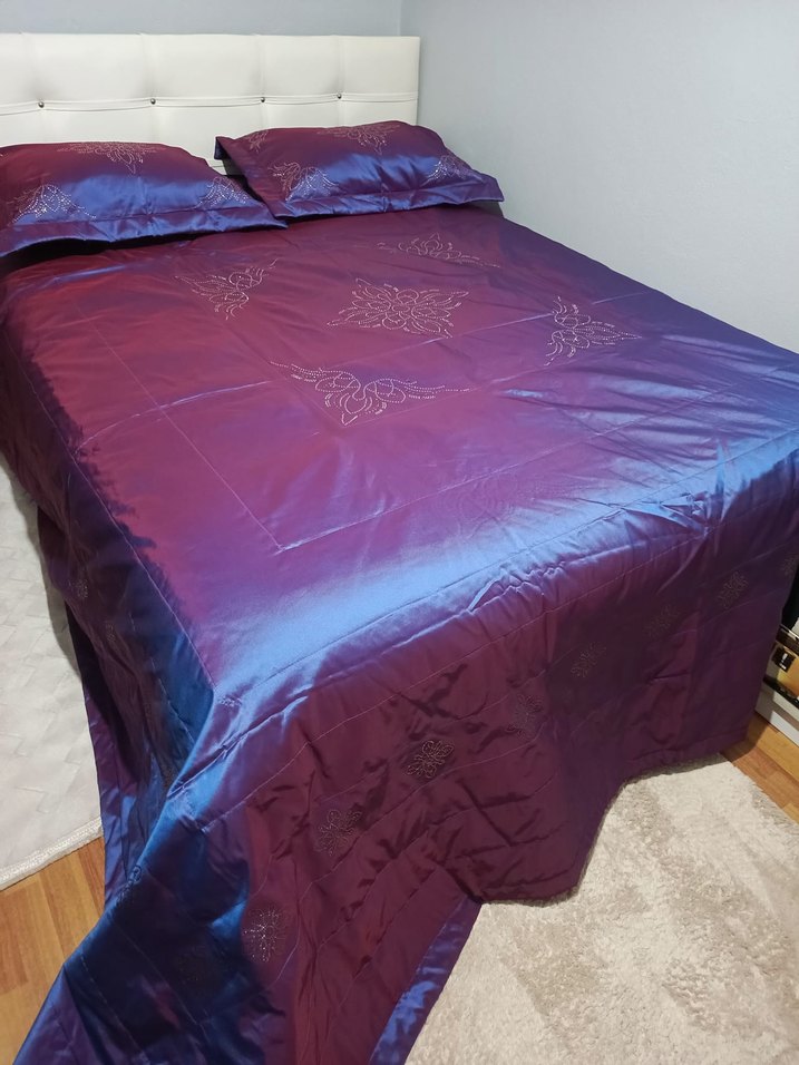 Parlak mor renkte, işlemeli desenlere sahip yatak örtüsü. Takım olarak uyumlu yastık kılıfları da içerir. ️özel dikim pamuk saten Saforoski taşlı 260x280 ölçülerinde sıfır üründür.