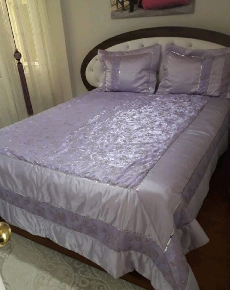 İşlemeli desenlere sahip parlak mor yatak örtüsü, yumuşak dokulu ve uyumlu yastık kılıfları ile birlikte. Yatak odasına şıklık katıyor ️.