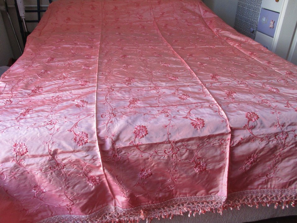 Parlak pembe kumaş üzerinde işlemeli çiçek desenleri ve püsküllü kenar detayına sahip yatak örtüsü. 260*240 cm